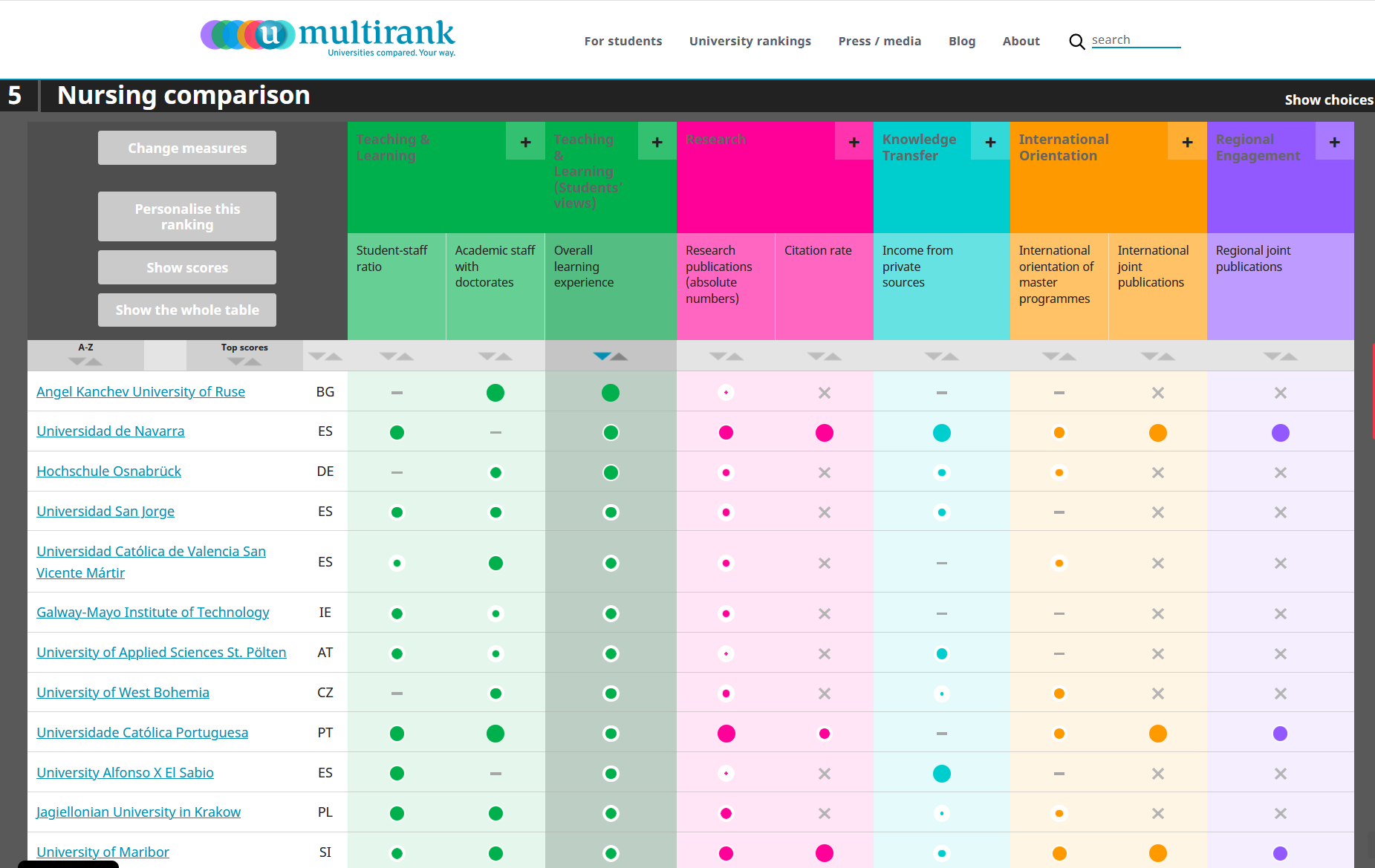 В изданието за 2021 г. по различни професионални направления са оценени общо 1101 университета от Европа, от тях – 727 от Европейския съюз, сред които 12 от България. Направление „Здравни грижи" на Русенски университет "Ангел Кънчев" е на второ място като общо представяне сред 44 университета от Европейския съюз, които провеждат обучение по него, и се нарежда на първо място за цялостна оценка на обучението (получено като резултат от 7 различни показателя) от анкетите на студентите.
